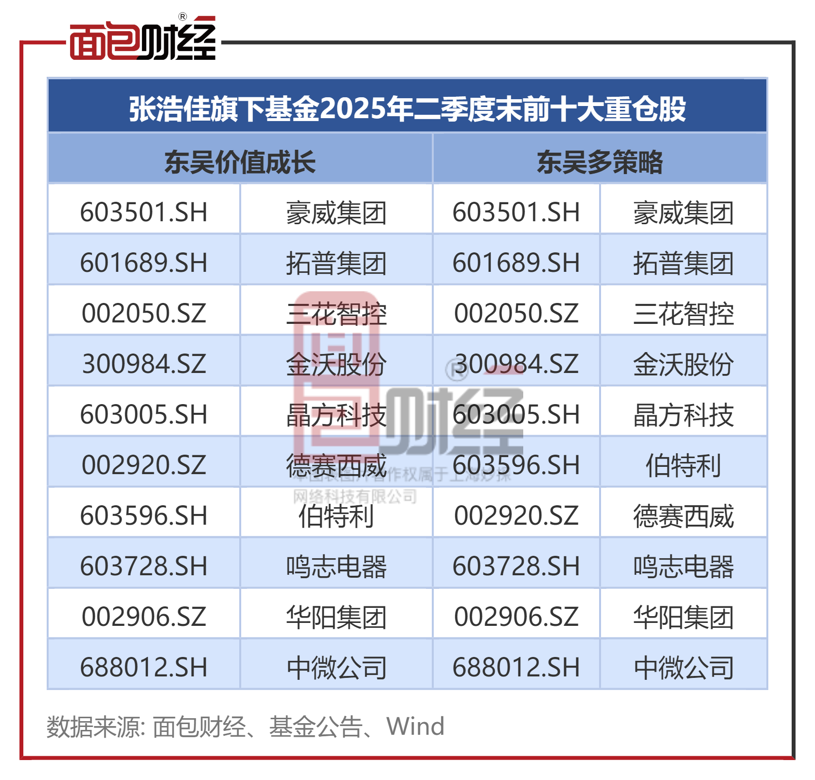 研究基金持仓发现,张浩佳旗下两只基金持仓较为雷同。根据基金二季报,东吴价值成长、东吴多策略的主要关注的投资方向是AI、半导体、机器人、智能网联汽车等,二季度末前十大重仓股几乎一致,均包括豪威集团、拓普集团、三花智控等。