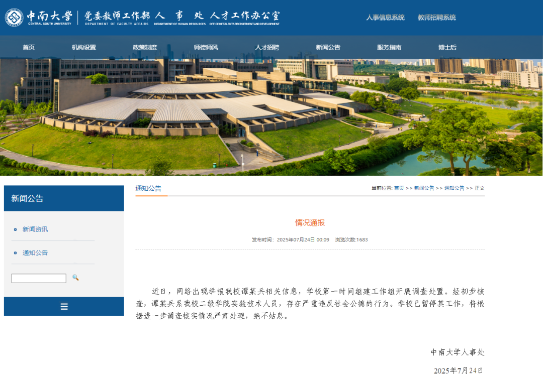 7月24日,中南大学人事处发布情况通报: