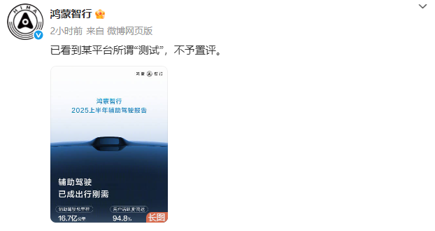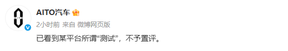 鸿蒙智行、AITO汽车、智界汽车官方微博发文表示:“已看到某平台所谓“测试”,不予置评。”