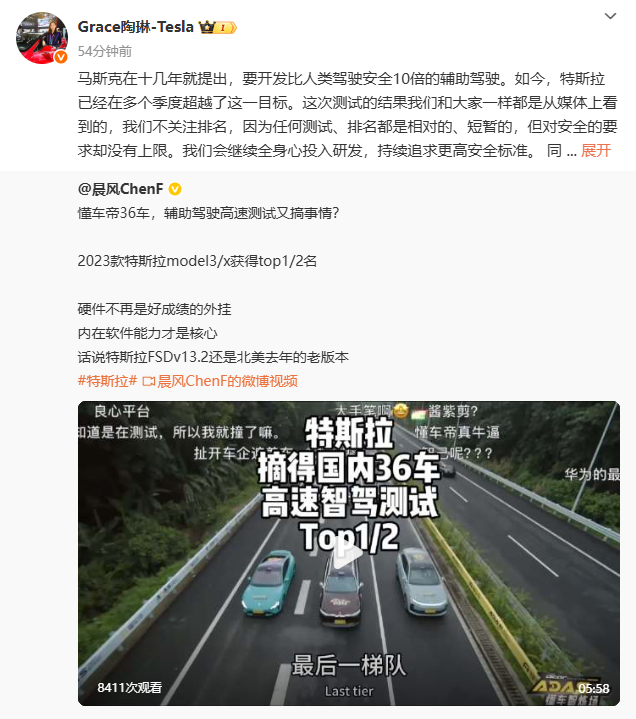 特斯拉副总裁陶琳在微博回应,称马斯克在十几年就提出,要开发比人类驾驶安全10倍的辅助驾驶。并表示“我们不关注排名,因为任何测试、排名都是相对的、短暂的,但对安全的要求却没有上限。”
