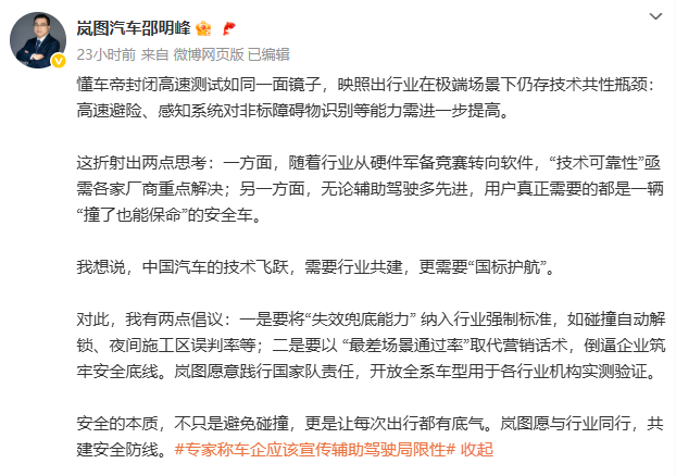 岚图汽车CBO、销售公司总经理邵明峰发文表示,懂车帝封闭高速测试如同一面镜子,映照出行业在极端场景下仍存技术共性瓶颈:高速避险、感知系统对非标障碍物识别等能力需进一步提高。