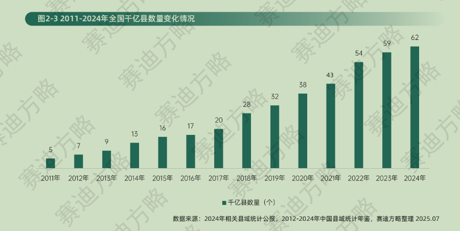 “千亿县”再度扩容。根据《研究》,2024年“千亿县”总数达到62个,2023年“千亿县”总数为59个,2022年为54个。