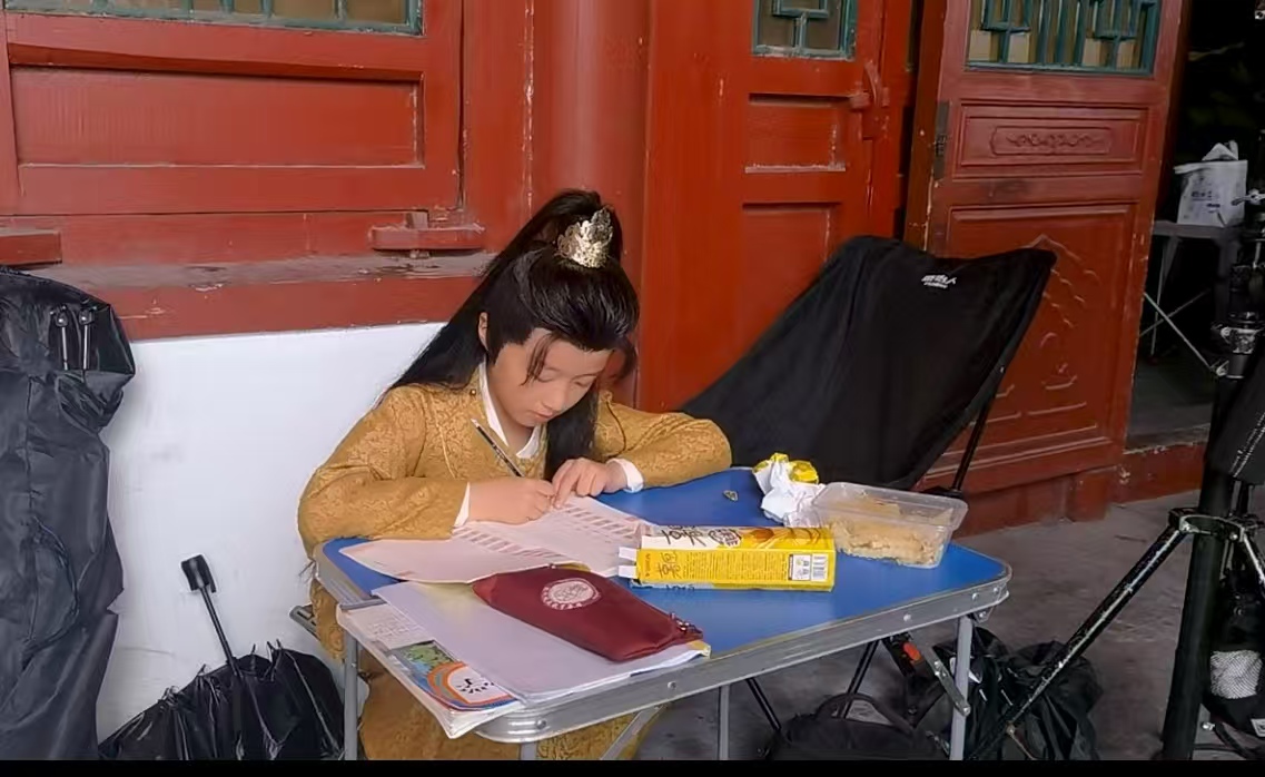 杭杭在拍摄现场抽空学习。(受访者供图)