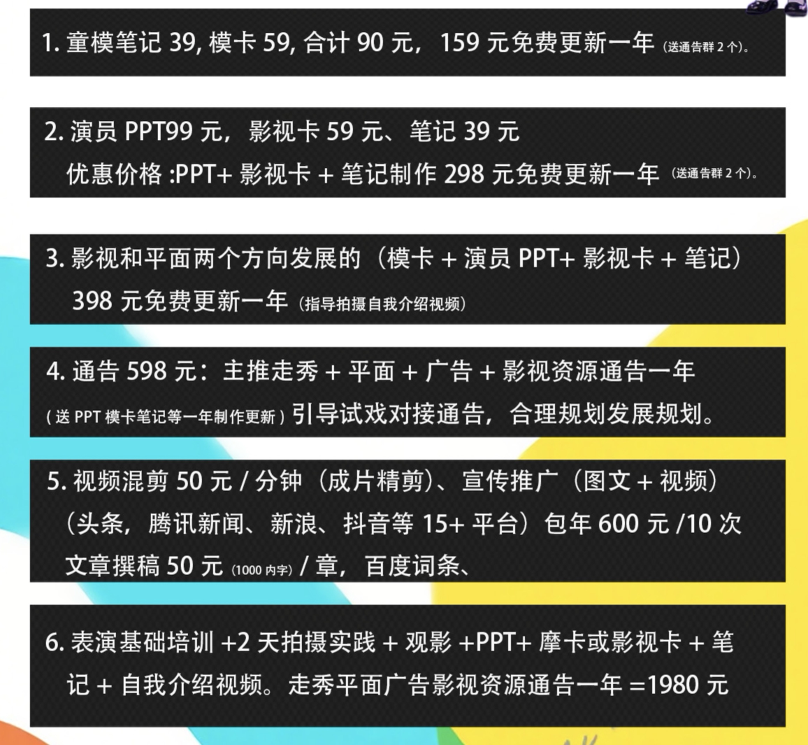 在上述家长采访中,儿童演员经纪人在演员和剧组之间充当了一个重要的沟通角色。蓝鲸科技记者以家长身份联系到山东一家演艺公司,经纪人聂洋表示,公司提供多种经纪合约,家长可以根据需求选择,他推荐称,多数家长选择598元套餐,包含一年的“走秀+平面+广告+影视资源通告”,引导试戏、对接通告,合理规划发展,并送模卡、个人介绍PPT制作。