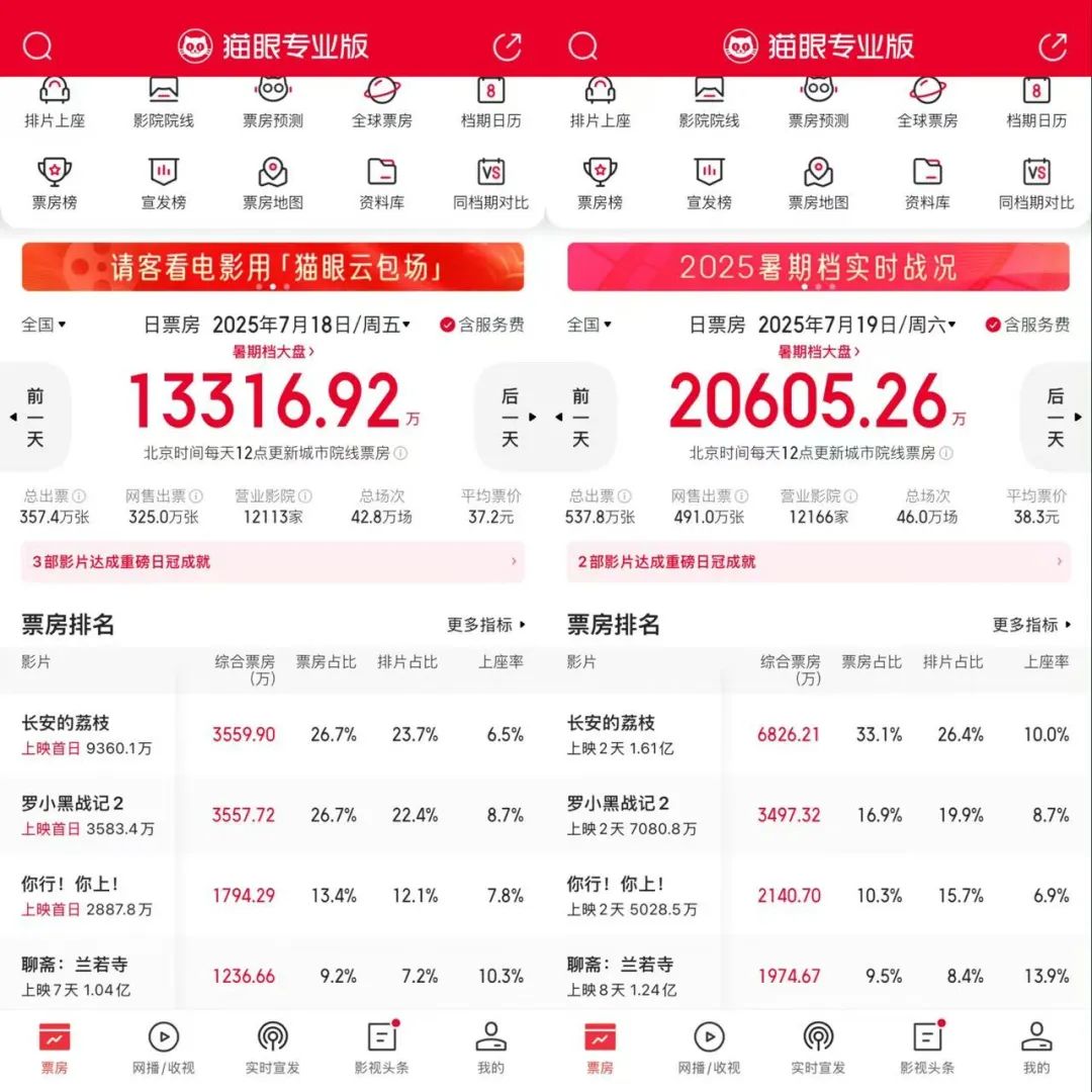 两巨头外其他公司发行的影片,几乎没什么优势。7月18日这天,面对激烈竞争,联瑞发行的姜文导演新片《你行!你上!》首日只拿下12%排片。好在第二日,《罗小黑战记2》“吐了”一些排片出来,《你行!你上!》的排片有所增加。
