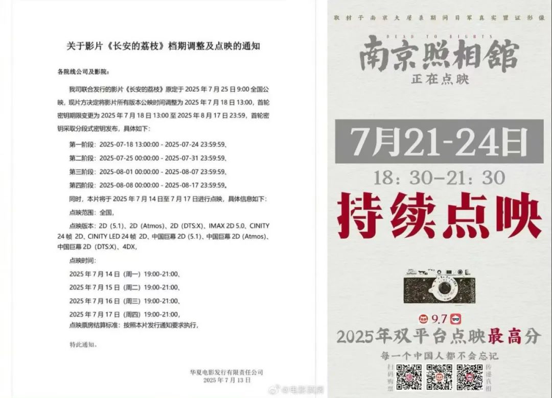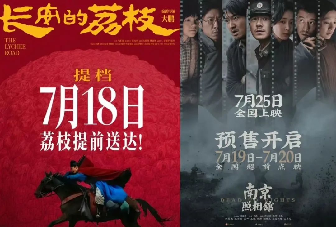 两大头部影片选中同一个黄道吉日,自然也引发了同档期电影的连锁反应。首映礼都办完了的《戏台》,连夜宣布改档,逃到竞争压力较小的7月25日。谁料另一个大头部《南京照相馆》又提档至7月25日,并于7月19日开启限时点映。这是完全不给《戏台》留活路啊。