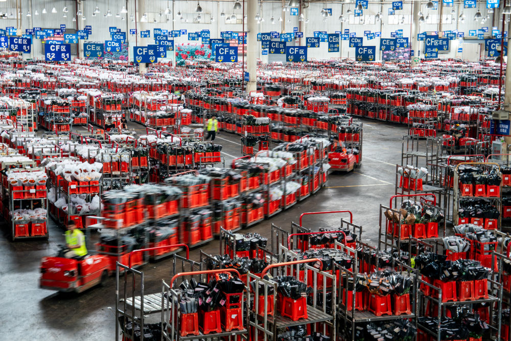 台车在昆明国际花卉拍卖交易中心内转运鲜花(7月9日摄)。新华社记者 胡超 摄