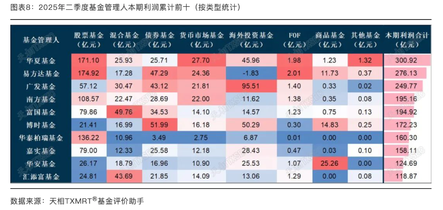 其中,华夏基金、易方达基金、广发基金本期利润合计排名前三,分别为300.92亿元、276.13亿元、249.77亿元。