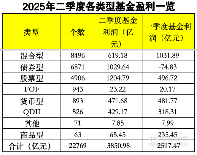 天相投顾数据显示,2025年二季度公募基金整体盈利达3850.98亿元,所有基金类型均实现正利润。