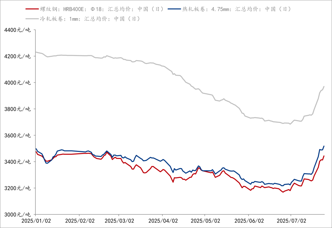 螺纹钢主力合约7月25日下午收盘价报3356元/吨,盘中价格创4个多月以来新高,较6月3日年度最低价(2912元/吨)累计上涨15.2%。热卷主力合约同期收于3507元/吨,盘中价格创5个月以来新高,较年内低点上涨16%,延续强势上行趋势。现货方面,上海钢联数据显示,7月25日国内18mm螺纹钢、4.75mm热轧板卷、1mm冷轧板卷价格分别为3444元/吨、3518元/吨、3970元/吨,相较于年内低点已上涨了8.7%、9.3%、7.7%。