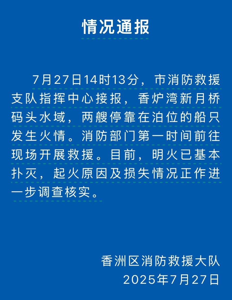 珠海市消防救援支队发布通报称,14时13分该支队指挥中心接报,香炉湾新月桥码头水域,两艘停靠在泊位的船只发生火情。消防部门第一时间前往现场开展救援。目前,明火已基本扑灭,起火原因及损失情况正作进一步调查核实。