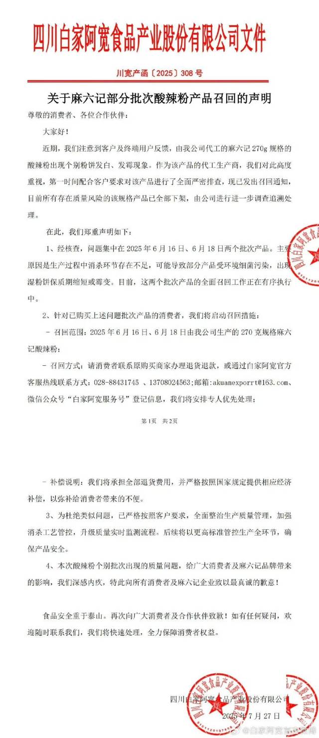 7月27日,麻六记代工方最先发出回应。四川白家阿宽食品产业股份有限公司发布声明,称其代工的麻六记270g规格酸辣粉部分批次出现质量问题,涉及2025年6月16日、6月18日两个批次,因生产过程消杀环节不足,导致产品可能受细菌污染,出现粉饼发白、发霉现象。目前,存在质量风险的该规格产品已全部下架,公司正对问题批次全面召回。