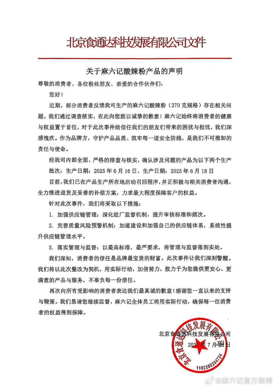 7月28日下午,麻六记官方微博发表声明道歉,称经公司内部排查与核实,确认涉及问题的产品为生产日期为2025年6月16日、6月18日的两个生产批次。