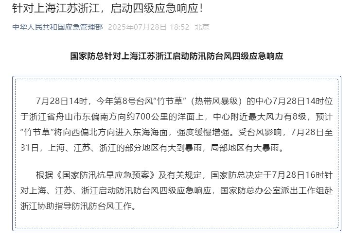 根据《国家防汛抗旱应急预案》及有关规定,国家防总决定于7月28日16时针对上海、江苏、浙江启动防汛防台风四级应急响应,国家防总办公室派出工作组赴浙江协助指导防汛防台风工作。