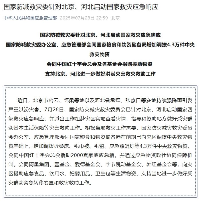 近日,北京市密云、怀柔等地以及河北省承德、张家口等多地持续强降雨引发严重洪涝灾害。7月28日,国家防灾减灾救灾委员会已针对北京、河北启动国家四级救灾应急响应,并派出工作组赴灾区实地查看灾情,指导和协助地方做好受灾群众基本生活保障等灾害救助工作。根据当地救灾工作需要,国家防灾减灾救灾委员会办公室、应急管理部会同国家粮食和物资储备局在前期已向灾区调拨中央救灾物资基础上,增加调拨折叠床、毛巾被、毛毯、应急照明灯等4.3万件中央救灾物资,会同中国红十字会总会援助2000套家庭应急箱,并通过应急物资政社协同保障机制,会同阿里集团、壹基金、爱德基金会、字节跳动基金会、韩红基金会等,向灾区援助应急食品、饮用水、妇婴用品、卫生包等生活物资,支持当地进一步做好受灾群众紧急转移安置和救灾救助工作。
