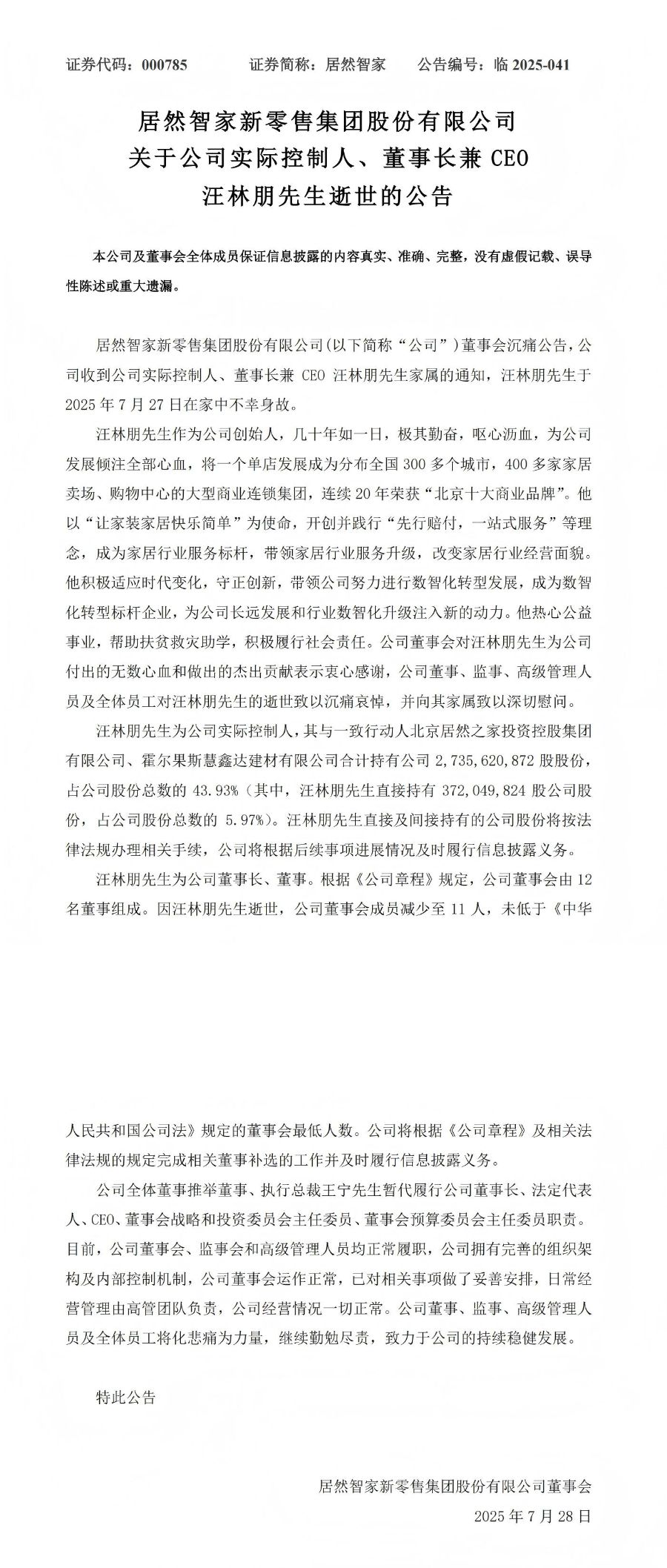 7月28日,居然智家(000785.SZ)公告称,公司实际控制人、董事长兼CEO汪林朋于2025年7月27日在家中不幸身故。公司已对相关事项做了妥善安排,日常经营管理由高管团队负责,公司经营情况一切正常。