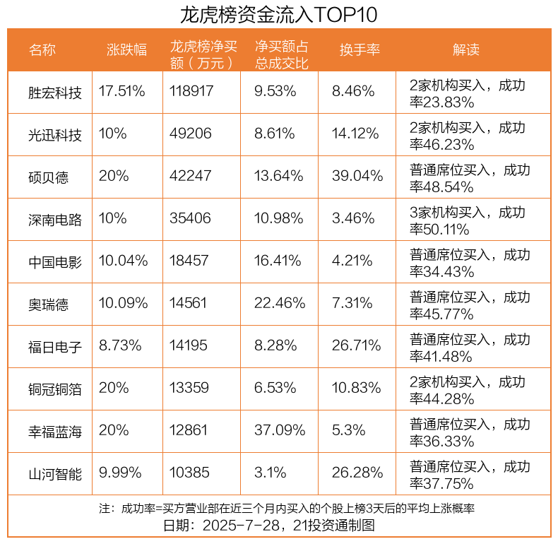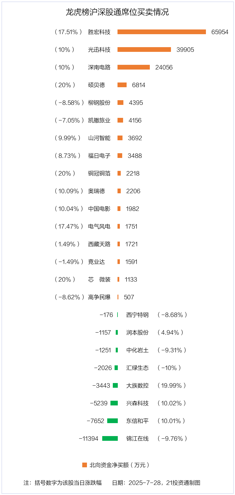 7月28日,上证指数上涨0.12%,深证成指上涨0.44%,创业板指上涨0.96%。盘后龙虎榜数据显示,共有48只个股因当日异动登上龙虎榜,资金净流入最多的是胜宏科技(300476.SZ),达11.89亿元。