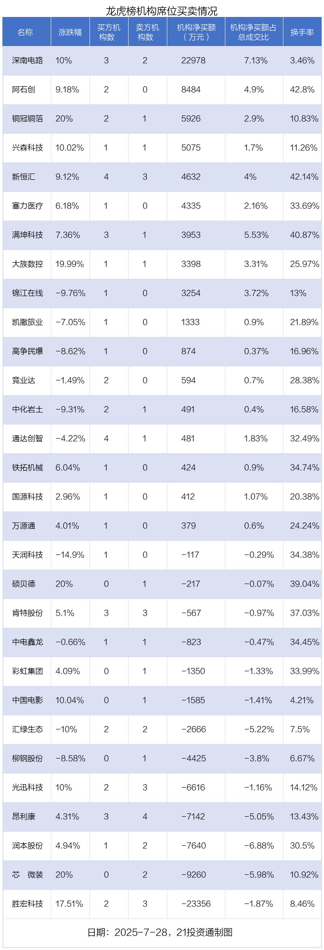 其中,机构净买入金额最多的是深南电路(002916.SZ),当日收盘上涨10%,换手率为3.46%。