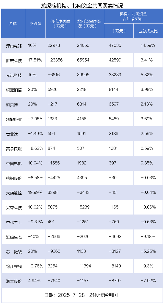 值得注意的是,机构和北向资金共同净买入了深南电路、凯撒旅业、铜冠铜箔、竞业达、高争民爆;共同净卖出了润本股份、汇绿生态;在胜宏科技,光迅科技,硕贝德,柳钢股份,中国电影,芯碁微装,中化岩土,大族数控,兴森科技,锦江在线上出现分歧,机构净卖出胜宏科技2.34亿元,北向资金净买入6.6亿元;机构净卖出光迅科技6615.98万元,北向资金净买入3.99亿元;机构净卖出硕贝德216.75万元,北向资金净买入6814.01万元;机构净卖出柳钢股份4425.32万元,北向资金净买入4394.91万元;机构净卖出中国电影1585.13万元,北向资金净买入1982.05万元;机构净卖出芯碁微装9259.61万元,北向资金净买入1133.06万元;机构净买入中化岩土490.76万元,北向资金净卖出1251.25万元;机构净买入大族数控3398.09万元,北向资金净卖出3442.59万元;机构净买入兴森科技5074.85万元,北向资金净卖出5239.39万元;机构净买入锦江在线3253.72万元,北向资金净卖出1.14亿元。