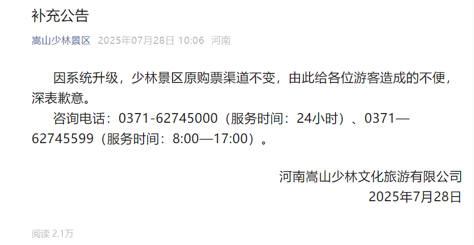 7月28日,嵩山少林寺再发布补充公告。公告内容显示因系统升级,少林景区原购票渠道不变,由此给各位游客造成的不便,深表歉意。