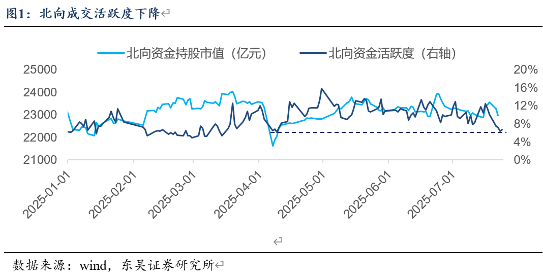北向资金:今年以来,北向资金持股市值在2.3万亿中枢附近波动,6月下旬以来北向资金持股市值开始下滑,北向资金活跃程度(成交额占A股比例)自5月以来中枢下移,6-7月在8%-12%区间内窄幅波动,近期已经下行至6%附近,接近4月7日左右水平。