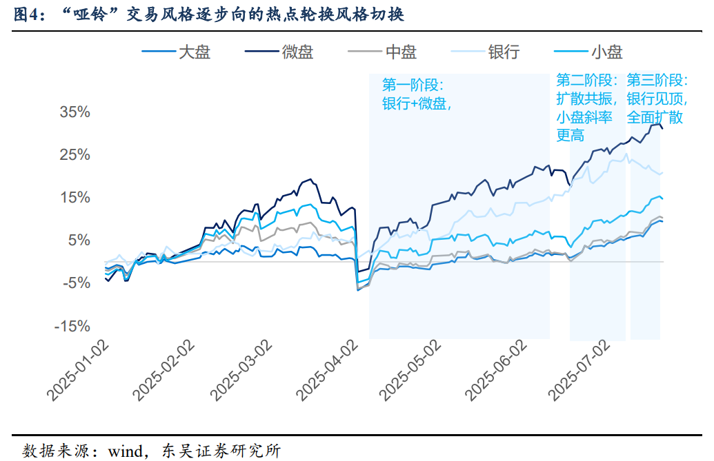风格从“哑铃”向全板块扩散: 4月初至6月中旬市场持续上行的过程中,微盘股和银行股是市场主要的方向,呈现“哑铃”交易结构,而其他大、中、小盘均呈现横盘震荡的趋势。6月末至7月初全市场板块均开始上行,小盘相对中、大盘斜率更高,7月中旬银行板块见顶后,其他板块则继续接力,风格从“哑铃”全面扩散。