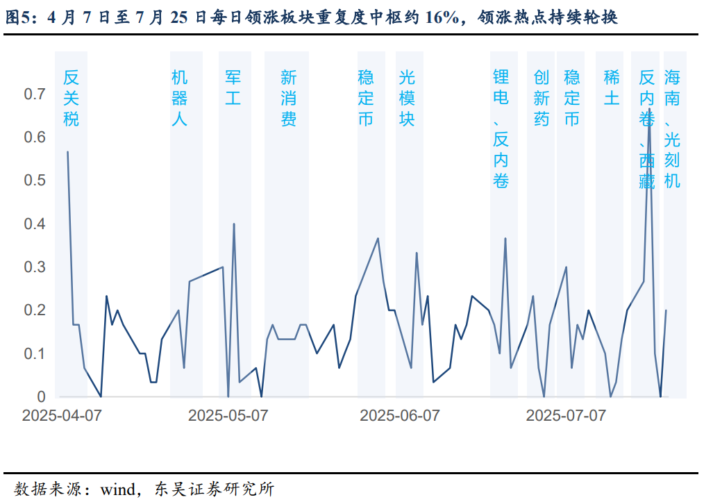 4 月 7 日至 7 月 25 日,单日的领涨概念重复度均值持续在 16%附近,说明市场热点分布较为分散,与前日相比上涨的主题重复度偏低,热点上行缺乏持续性。综合选择上涨相对持续时间较长的概念所属的大主题,最多 2 至 3 个交易日,市场热点就会向下一个主题进行切换,除稳定币和反内卷外,市场选择的领涨主题几乎没有再重复,呈现了明显的快速轮动特征,与资金结构化流入的特征一致。