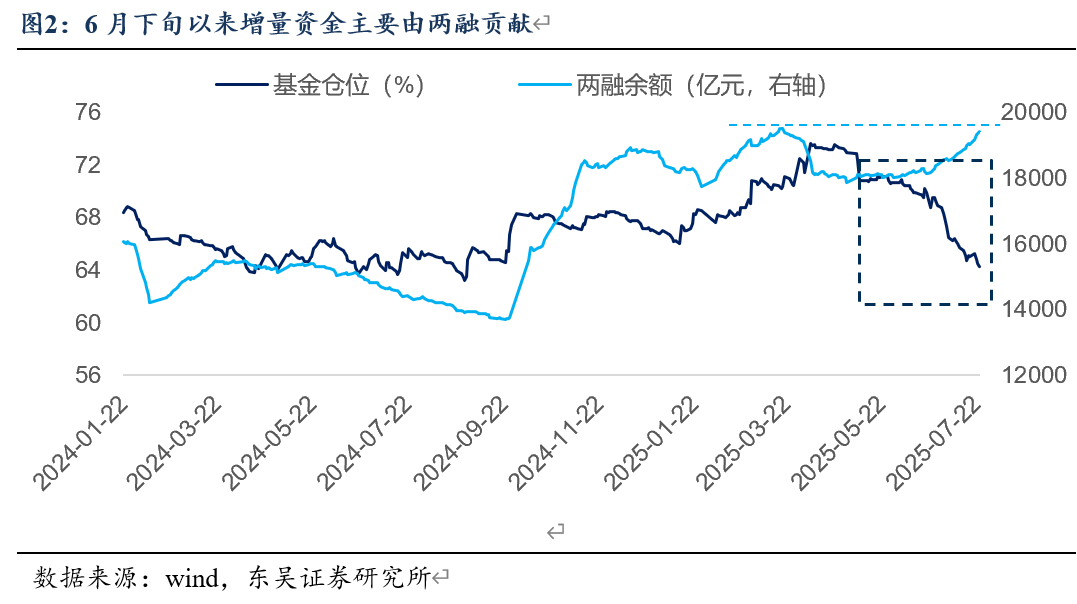 两融资金:两融余额年初自6月下旬开始加速上行,7月24日达到1.94万亿,目前已经接近2025年3月1.95万亿的历史高点。