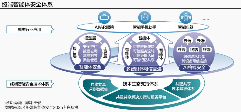 其中,智能体安全技术涉及安全护栏、数据去毒、基座对齐和柔性管理;多智能体可信互连技术涉及可信数据流转、可信服务流转、可信身份认证和可信记忆共享;AI终端安全技术涉及可信隐私沙盒、跨设备可信连接。