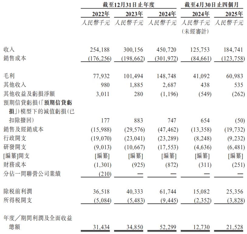 业绩方面,2022年-2024年,公司销量分别为14.9万辆、15.69万辆、22.95万辆,复合年增长率为24.1%;对应营收为2.54亿元、3亿元、4.51亿元,净利润分别为3143万元、3485万元、5230万元。