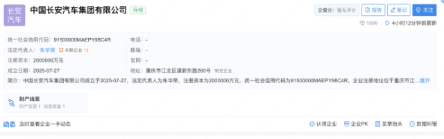 企查查显示,中国长安汽车集团有限公司(以下简称“中国长安”)于2025年7月27日正式注册成立,注册资本200亿元,法定代表人朱华荣。其注册资本低于中国第一汽车集团,却高于东风汽车集团。中国长安注册地位于重庆市江北区建新东路260号,也是第一家落地重庆的央企。