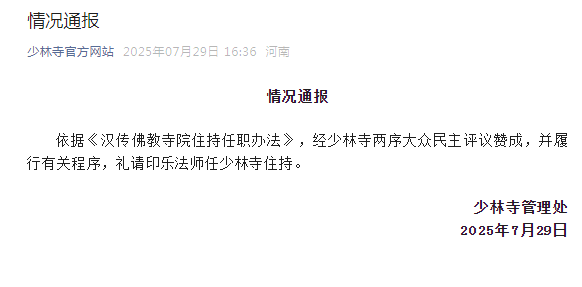 7月29日下午,据少林寺官方网站,依据《汉传佛教寺院住持任职办法》,经少林寺两序大众民主评议赞成,并履行有关程序,礼请印乐法师任少林寺住持。