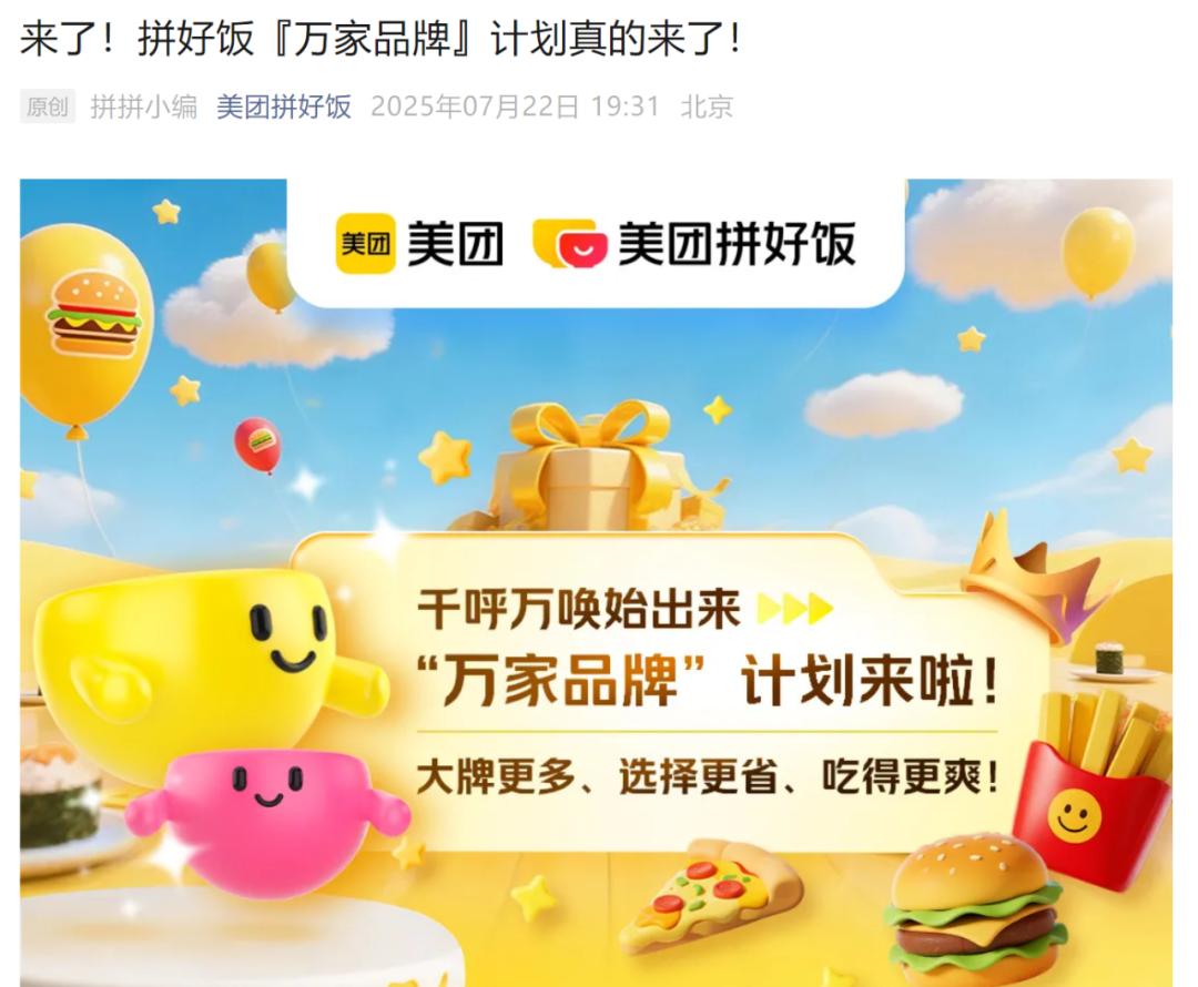 7月22日,美团官宣了拼好饭万家品牌计划,称拼好饭将引入1万家知名餐饮品牌。