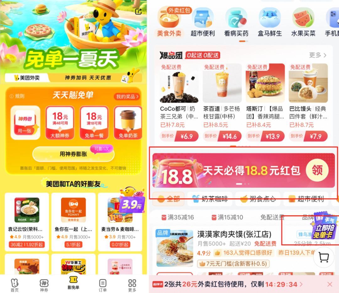 左为美团膨免单界面,右为淘宝闪购首页界面,图源美团APP、淘宝APP