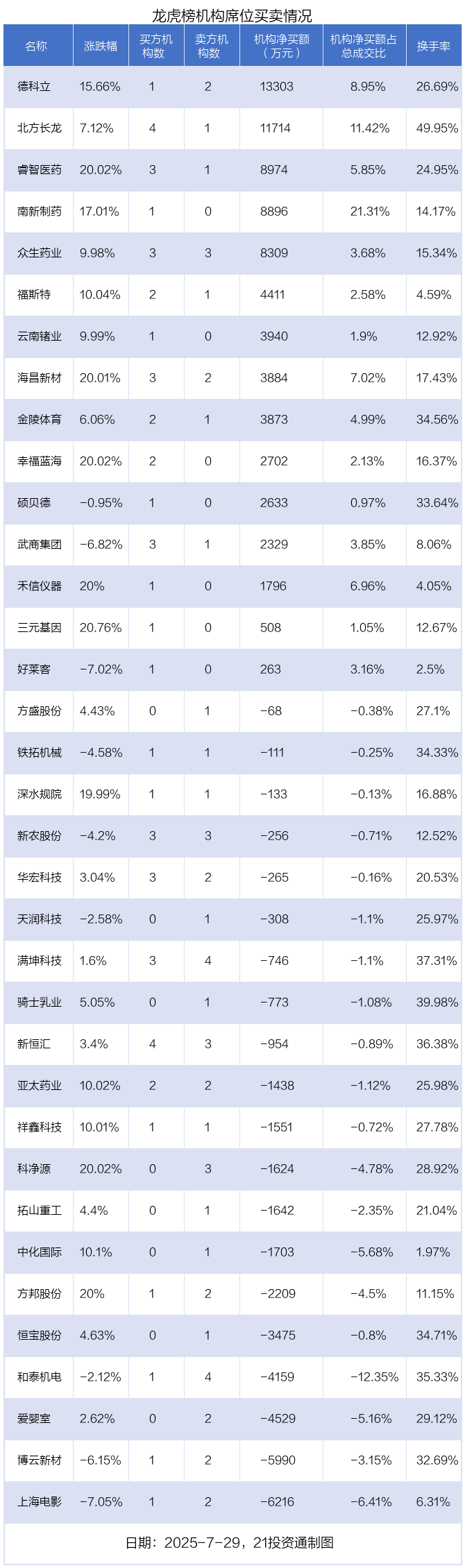 7月29日,35只个股龙虎榜出现了机构的身影,机构合计净买入3.94亿元。具体来看,机构净买入15股,净卖出20股。