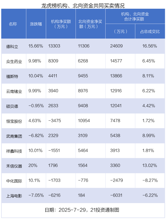 值得注意的是,机构和北向资金共同净买入了德科立、福斯特、硕贝德、云南锗业、众生药业、武商集团、禾信仪器等7股;共同净卖出了中化国际;在恒宝股份,祥鑫科技,上海电影上出现分歧,机构净卖出恒宝股份3475.44万元,北向资金净买入1.1亿元;机构净卖出祥鑫科技1550.9万元,北向资金净买入5464.25万元;机构净卖出上海电影6215.53万元,北向资金净买入184.13万元。