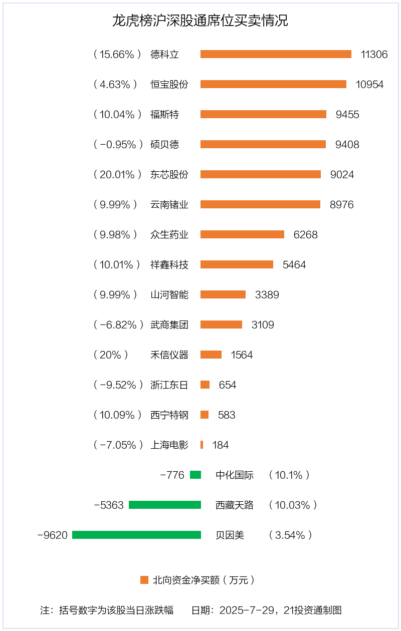 7月29日,北向资金参与龙虎榜中的个股共有17只,合计净买入6.46亿元。其中沪股通净买入7 股,净卖出2 股,合计净买入2.66亿元;深股通净买入7 股,净卖出1 股,合计净买入3.79亿元。