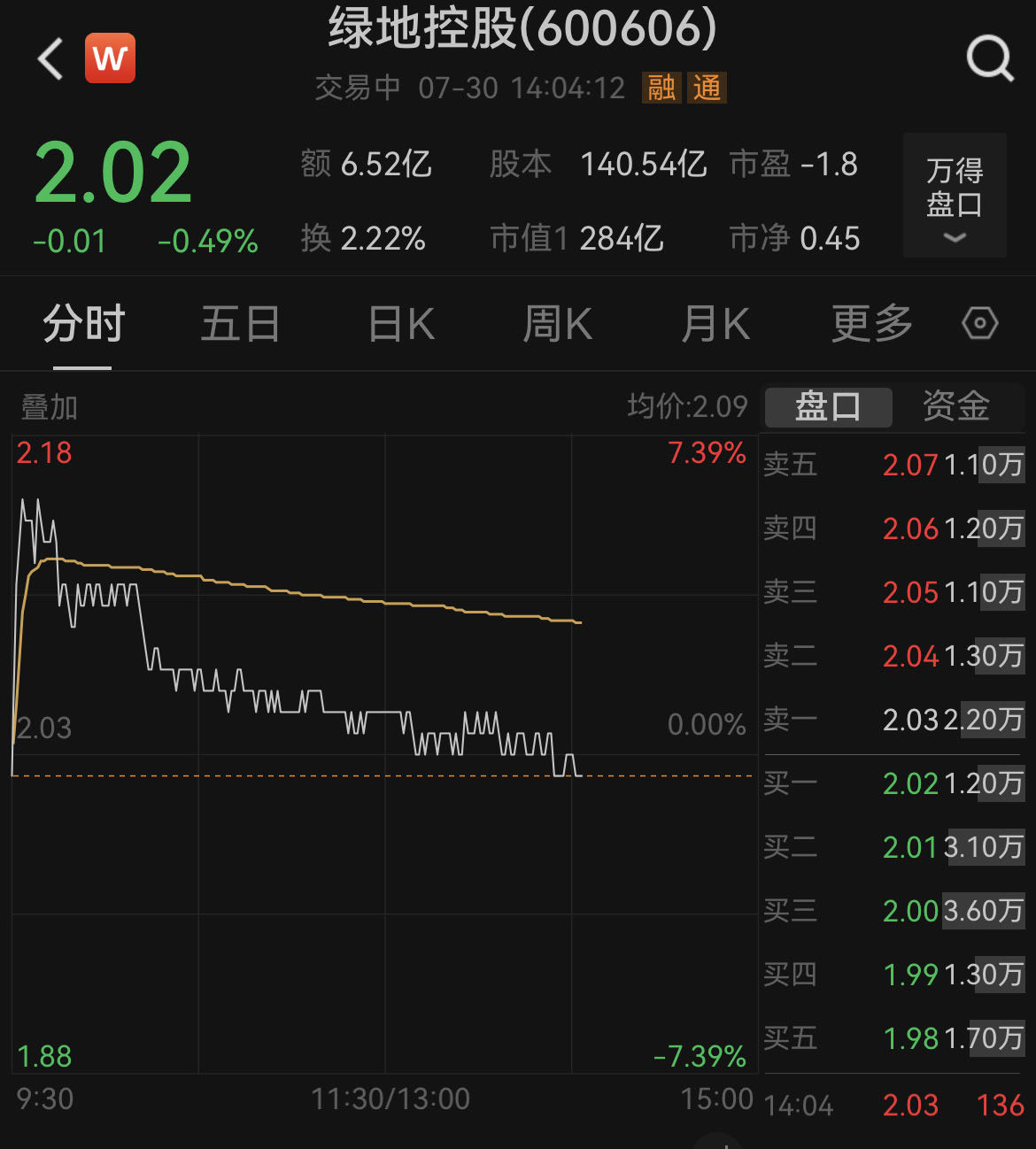 二级市场方面,7月30日,绿地控股股价一度涨至7.39%,随后快速震荡回落。截至14时04分,股价由涨转跌,微跌0.49%,报2.02元/股。