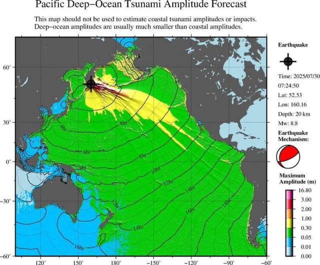 今天早上7时许,俄罗斯堪察加半岛东岸远海发生强烈地震。受地震影响,俄罗斯、日本、菲律宾、印度尼西亚、美国、加拿大、墨西哥等太平洋沿岸多地发布海啸预警或警报。