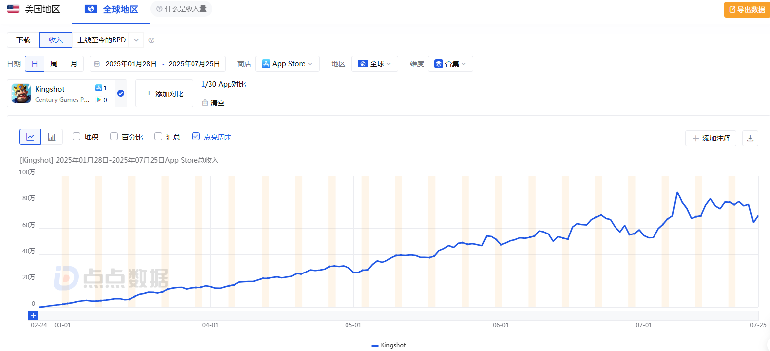 根据全球移动应用、游戏数据监测服务商点点数据的监测,《Kingshot》上线以来来自全球iOS平台的收入持续上升。