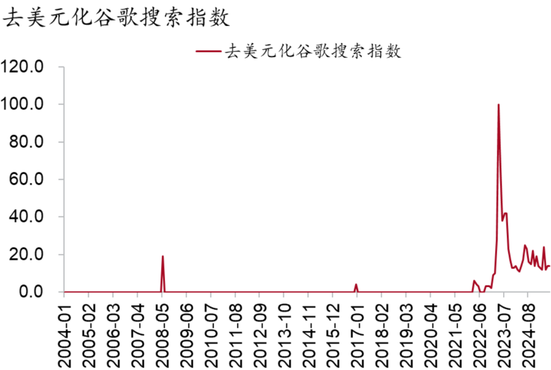 近年来,关于去美元化的讨论热度明显升温。谷歌搜索指数显示,2022年之前,仅有零星相关讨论。2022年俄乌冲突爆发后,美国对俄罗斯实施高强度金融制裁,将美元武器化,导致去美元化议题热度大幅飙升,之后持续发酵(图1)。