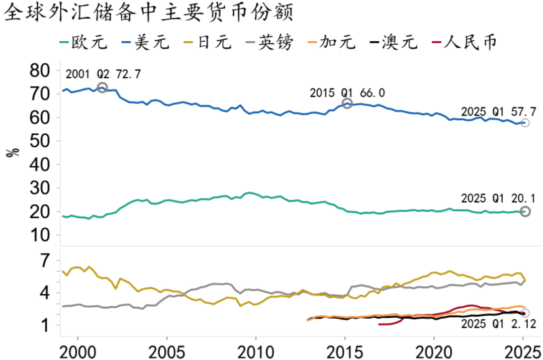 2001年至今,美元在外储中的占比从73%持续回落至58%(图3),驱动因素可能包括美国金融制裁的溢出效应、非美货币国际竞争力提升、央行储备资产管理策略多元化等。尽管美元的主导优势边际下降,但在全球储备资产中的核心地位仍然稳固。
