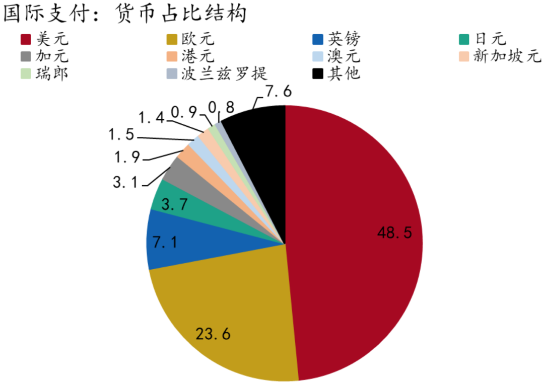 支付结算方面,美元居于主导地位(图5),份额仍在稳步抬升。