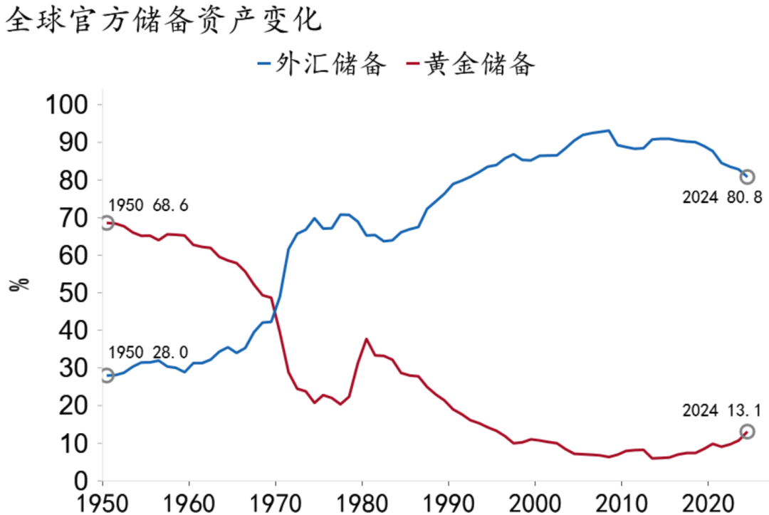 另一方面,其他货币对美元的替代性不足,储备货币体系的多元化特征愈发显著。21世纪以来,国际储备货币中美元份额的下降并非由单一货币承接,多种货币份额出现同步上升,包括英镑、欧元、澳元、加元、人民币等,其中英镑升幅最大。此外,从官方储备视角来看,近年来黄金份额亦自底部明显回升(图4),与新兴市场央行的大规模购金相关。在美国对俄罗斯高举金融制裁的大棒后,新兴市场国家央行意识到,若在储备资产中过度依赖单一货币,可能面临巨大的政治尾部风险。黄金因此备受青睐,进一步推动了储备资产的多元化进程。简而言之,与其说当前在去美元化,不如说全球储备资产正在多元化。