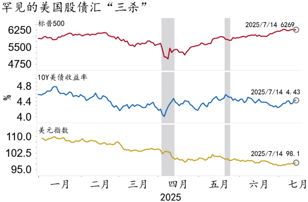 今年以来,在全球贸易战与美国财政可持续风险发酵先后催化下,去美元化一度成为全球金融市场交易的主导逻辑。上半年美元显著走弱,美债利率高位震荡,美股先跌后涨巨幅震荡,黄金、非美货币、港股、欧股等其他主要资产走强,“美国例外论”遭遇巨大挑战。特别是4月2日美国“对等关税”政策落地后的一周内,以及5月下旬20Y美债惨淡的拍卖结果公布后,市场对美元资产的信任锚点出现明显松动,美国股债汇市场两次上演“三杀”行情(图2),标普500指数最大跌幅逼近15%,10Y美债利率升破4.5%,美元跌破100关口,资金从美股、美债、美元货币基金中大幅流出。