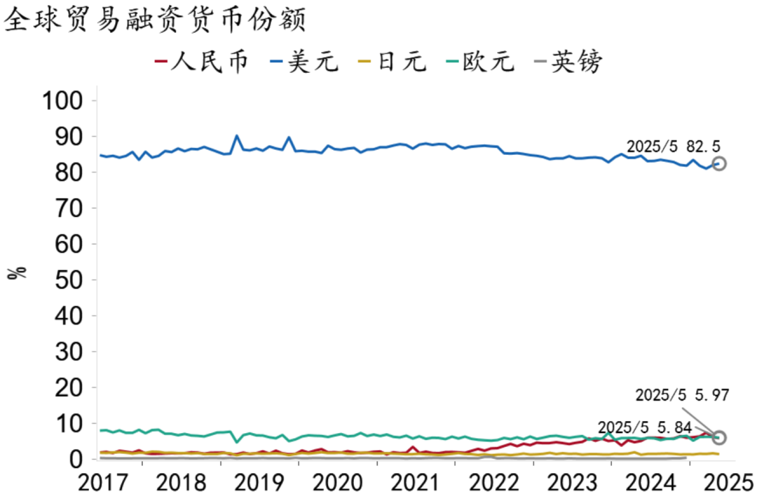融资领域的表现同样印证了美元的主导地位。国际债券发行方面,美元、欧元和英镑是主要的融资货币,其中美元占比居首为46%,欧元次之为37%,英镑为9%,其余货币基本在3%以内。而在贸易融资方面,美元的优势更为显著,其市场份额始终稳定在80-90%之间(图8),其他货币则维持低位。