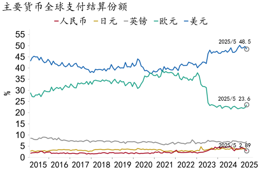 综上所述,当前数据显示,尽管全球储备资产中美元份额缓慢下降,但综合视角下的去美元化并未发生,美元在国际货币体系中的龙头地位依然稳固,特别是在跨境投融资领域。