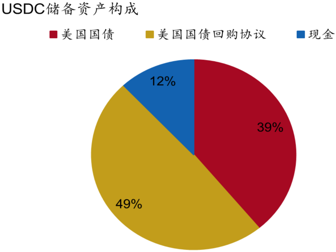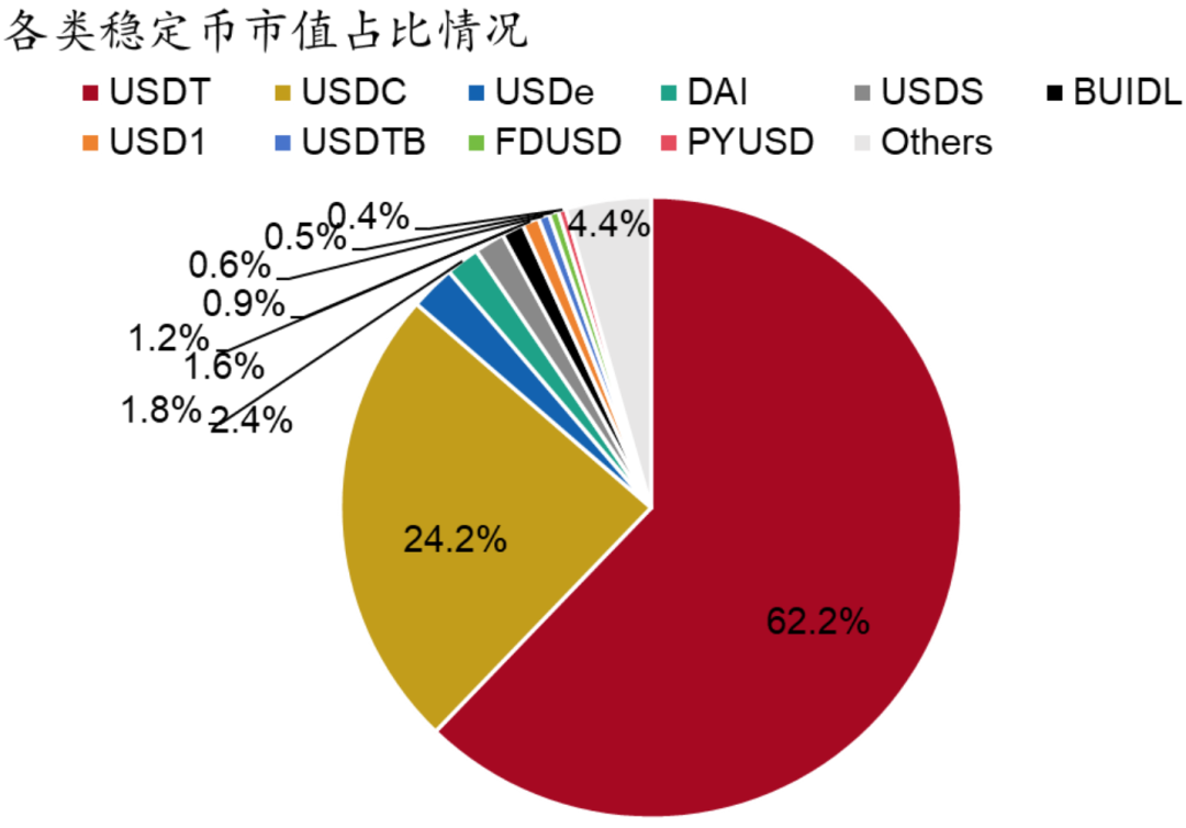 值得注意的是,当前稳定币快速崛起,或助力美元霸权在数字世界延伸。稳定币是一种与特定资产/法定货币锚定,价格相对稳定的加密货币。当前与美元挂钩的稳定币居于主导地位。美元稳定币的发行方须持有1:1的高流动性储备资产,例如美元现金、短期美债等(图11)。当前USDT(Tether)、USDC(USD Coin)是规模最大的两大美元稳定币,合计市值占稳定币总体规模的八成以上(图12)。虽然当前稳定币在加密货币中的市场份额仅约7%,但在加密货币交易和跨境转账交易中发展速度极快。近期美国加速推进稳定币的立法进程以明晰监管框架,旨在通过数字化手段强化美元在国际货币体系中的核心地位,构建美国数字金融霸权。