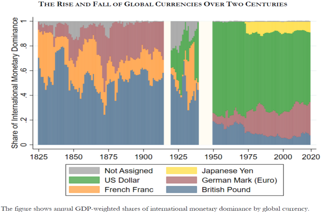20世纪20年代,一战冲击下,国际货币版图开始重构,美元快速崛起,打破了英镑作为单一货币主导的局面。经济学家巴里·艾肯格林(Barry Eichengreen)估算,美元一度在20世纪20年代中期超越英镑成为主要的储备货币【注释1】。但进入20世纪30年代,美国大萧条影响下,美元地位下降,英镑重新夺回国际货币体系的主导权。