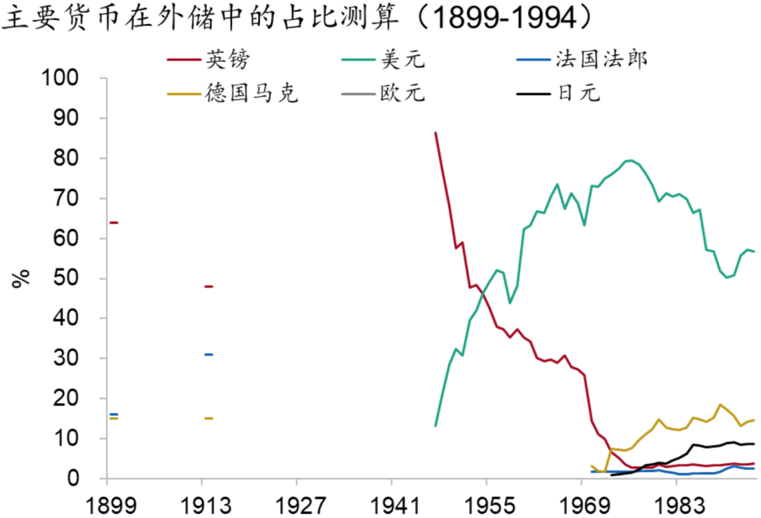 19世纪末至一战前,英镑是国际货币体系中的主角,主要凭借英国高度发达的银行体系,英格兰银行对流动性的成熟管理,以及金本位下伦敦黄金中心的核心地位。当时法国法郎、德国马克亦占据重要地位,而美元尚未崭露头角。
